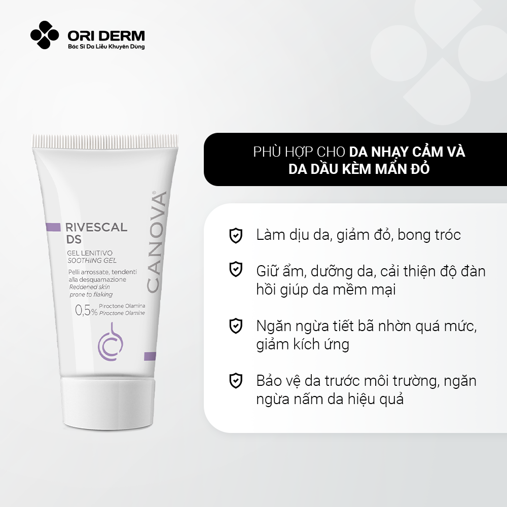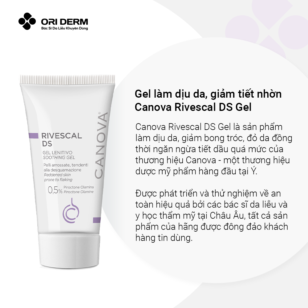 Canova Rivescal DS Gel là sản phẩm làm dịu da, giảm bong tróc, đỏ da đồng thời ngăn ngừa tiết dầu quá mức của thương hiệu Canova - một thương hiệu dược mỹ phẩm hàng đầu tại Ý. Được phát triển và thử nghiệm về an toàn hiệu quả bởi các bác sĩ da liễu và y học thẩm mỹ tại Châu Âu, tất cả sản phẩm của hãng được đông đảo khách hàng tin dùng.