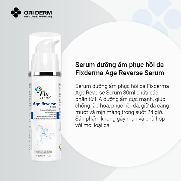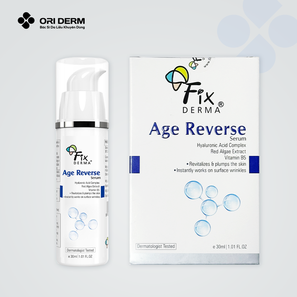 Serum Fixderma Age Reverse Serum là sản phẩm từ thương hiệu dược mỹ phẩm Fixderma đến từ Mỹ. Serum cung cấp độ ẩm, cải thiện đàn hồi, làm mờ nếp nhăn, vết thâm, đồng thời tăng cường đề kháng và bảo vệ da khỏi tác hại môi trường. Sản phẩm phù hợp mọi loại da, đặc biệt da khô và lão hóa.