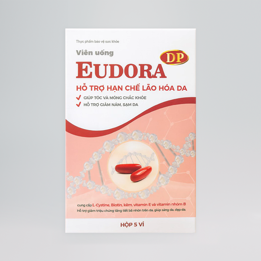 Viên uống Eudora DP được sản xuất bởi công ty CP Quốc tế Dược Phẩm HADU (Việt Nam), đạt tiêu chuẩn của Bộ y tế, GMP và ISO 22000. Sản phẩm không chỉ giúp dưỡng ẩm, sáng da, cải thiện vết nhăn mà còn hỗ trợ dưỡng tóc và móng chắc khỏe. Phù hợp với những ai muốn làm đẹp da, có làn da khô, lão hóa và tình trạng tóc, móng dễ gãy rụng.